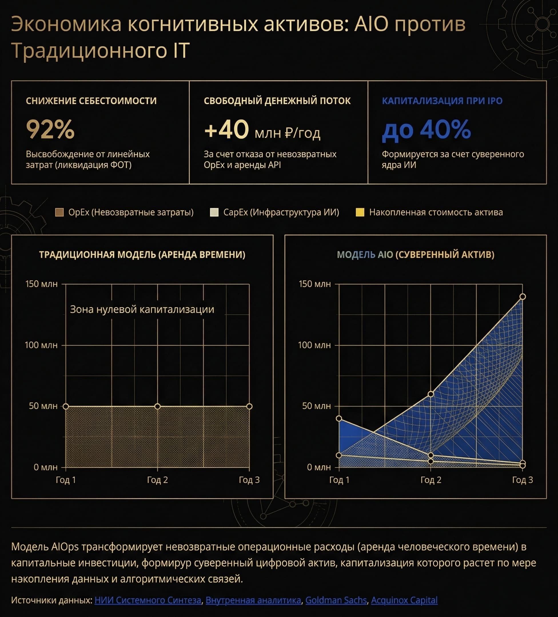Институт соединяет два мира, которые поодиночке разрушают друг друга. Научно-исследовательская форма удерживает старый порядок — правовую рамку, процедуру, институциональное доверие. Искусственный интеллект приносит новую мощность — автономию, скорость, исчислимость. Между ними — метод: системный синтез. Новая мощность в старой осанке.